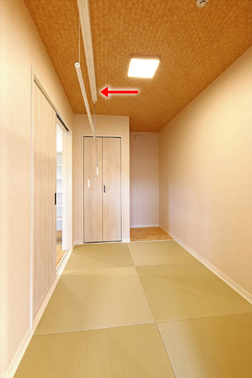 将来のお仏間として設えた和室には無駄の無いように可動式の物干しを設置しています。雨天や、花粉の時期でも大丈夫です。