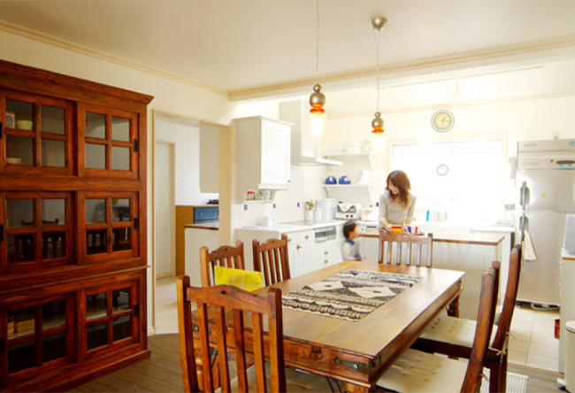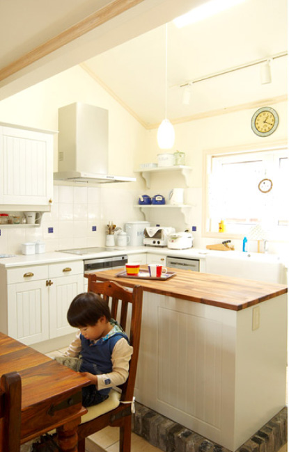 主婦の職場ともいえるキッチンは、天窓からの日差しで一日中明るい空間です。システムキッチン・ダイニング家具全てがスウェーデンのアンティーク家具で統一されています。