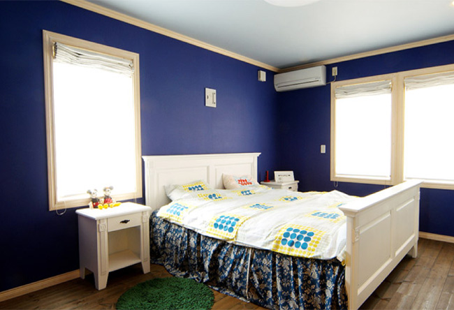 夫婦の寝室は、ダークブルーの壁と、白いスウェーデン製ベットのセレクトが素敵な空間です。