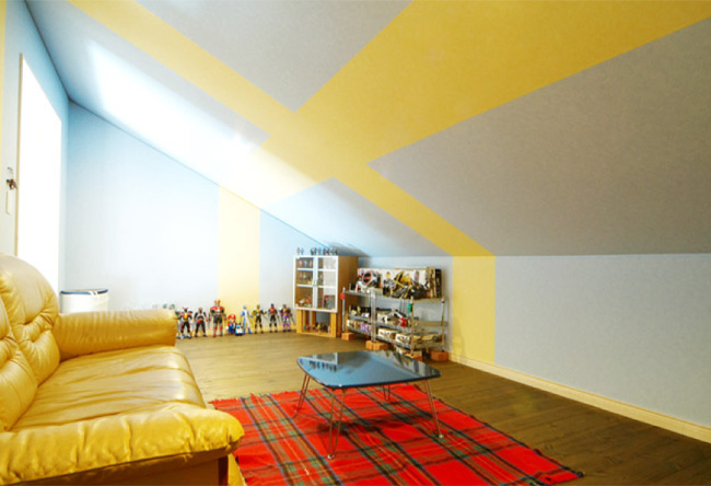 リビングを見下ろすロフト、それはロフトと呼ぶには勿体ないくらいの空間です。壁クロスはご主人のご希望でスウェーデンの国旗をモチーフにし、ご主人ご自慢の仮面ライダーのコレクションが並んでいます。
