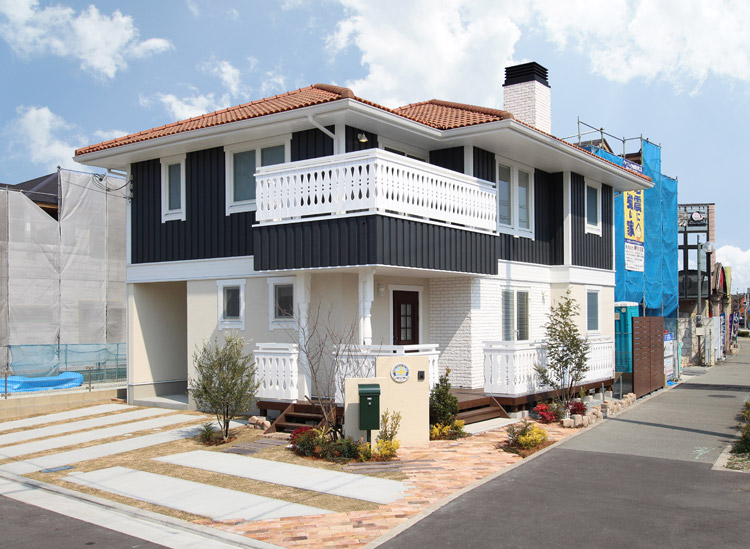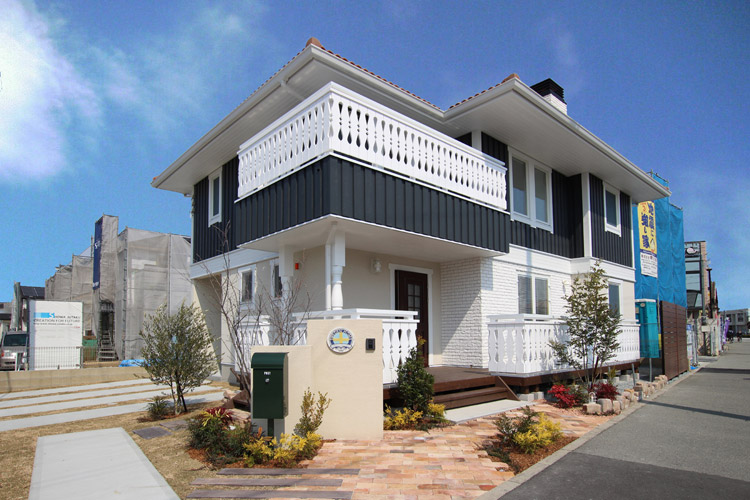 軒とモールディングで水平ラインを強調して、ライティアンなイメージを演出しています。そこにスプルス貼りの外壁メキシ石調のブリックタイルをあしらい、デッキエントランスで仕上げました。