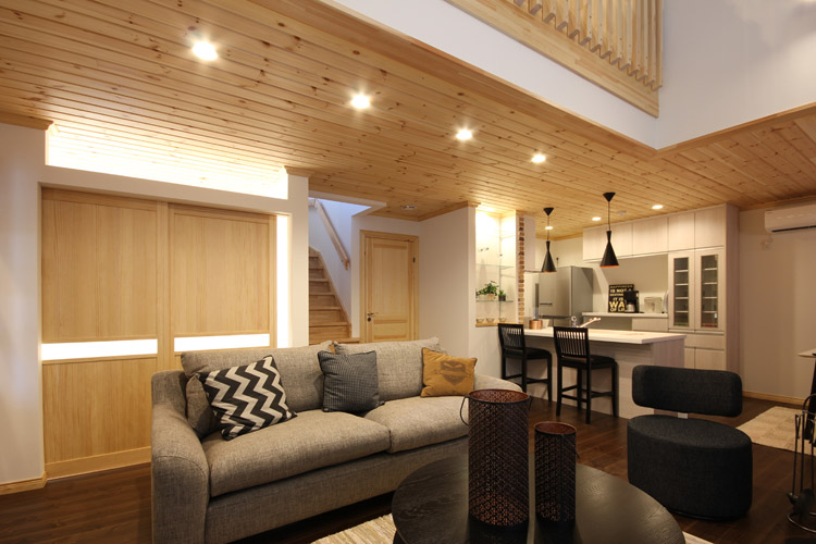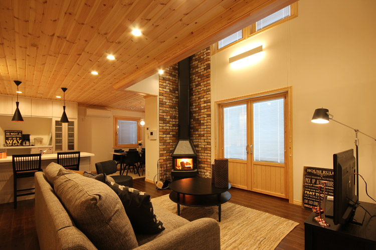 ボトムヘビーなダークブラウンの床にナチュラルの天井材、窓もナチュラルと基本的な色合いに黒い家具がアクセントになり、空間を締めています。