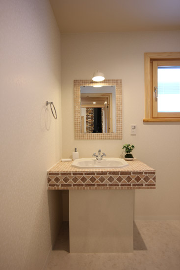 鏡の縁のタイルとカウンターの上のタイルをお揃いにして、少し遊んでみました。