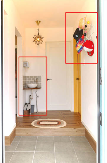 帰ってきてすぐ手洗いができるシンクがあります。帽子のハンガーは、“ハングイットオール”ミッドセンチュリーのアイテムが光っています。