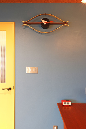 ブルーグリーンの壁紙に浮かぶ時計はジョージネルソンの名作 “アイクロック”。ビビットな色の中にミッドセンチュリーの名作が映えます。