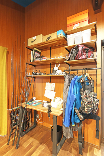 疑似餌や釣り道具を作成する机と可動棚はY様のDIYです。