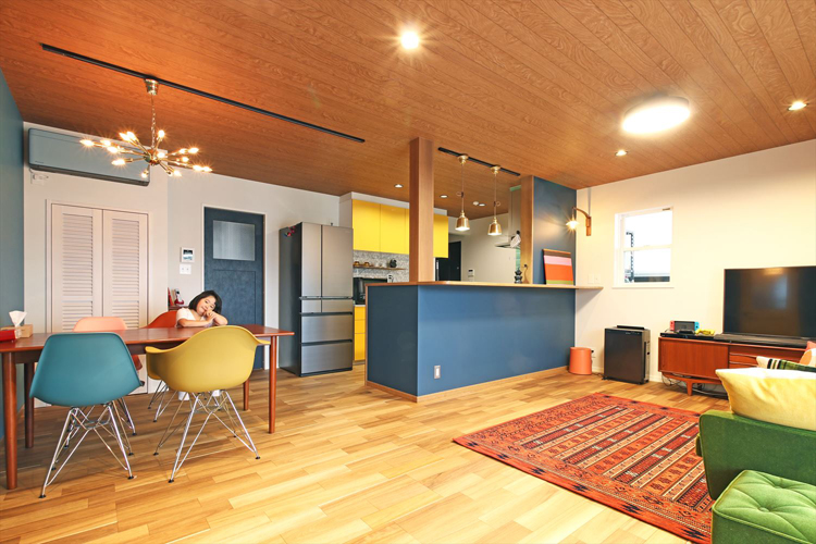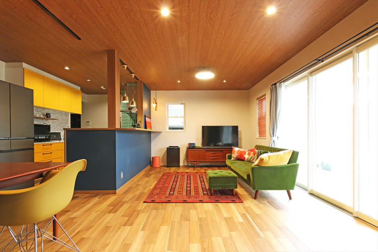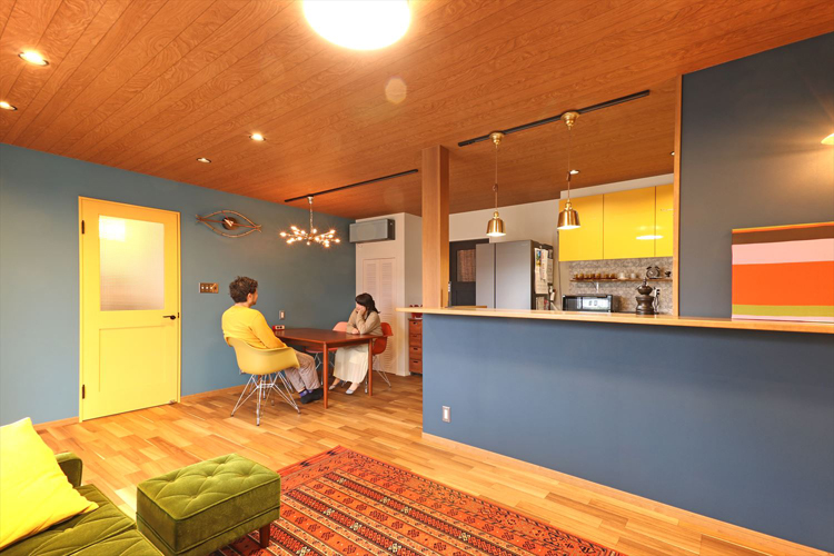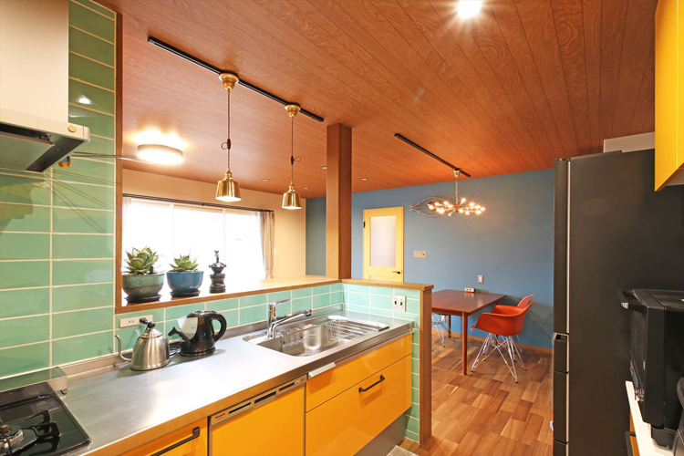 クラシカルアメリカンな外観とうって変わって、内観はPOPな色をふんだんに使ったミッドセンチュリー調に。ブルーグリーンとイエローをテーマにした素敵なインテリアです。お嬢様にもモデルとしてご協力頂きました。