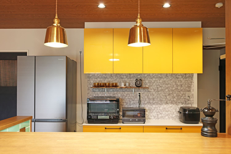 黄色いカップボードに並ぶ家電は黒がテーマ。Y様宅では家電すらオブジェに見えてしまいます。