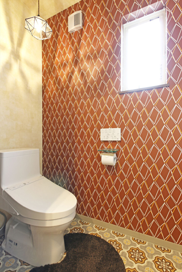 1階トイレとはうって変わって、テキスタイルで仕上げられたトイレ。ミッドセンチュリー好きのY様っぽい仕上げです。