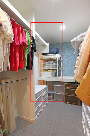 主寝室のドアを開けるとこんな感じでパジャマやお布団がサッと取り出せます。これもY様のアイデア。超便利です。