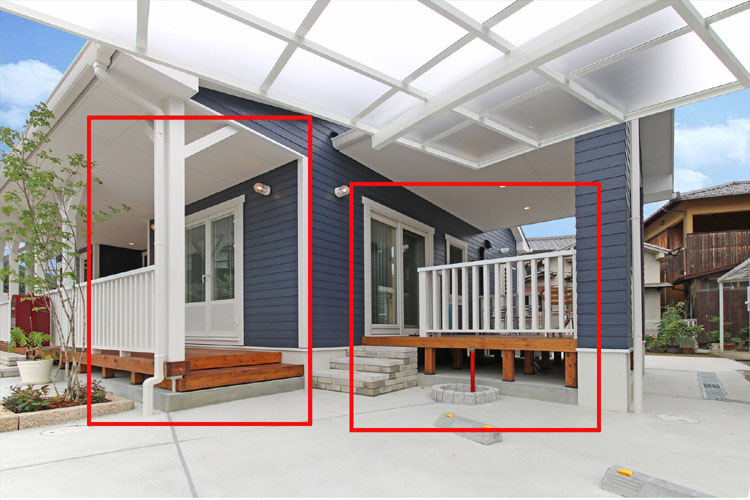 少し明るめのチーク色で仕上げたデッキエントランス。ネイビーの外壁によく合っています。