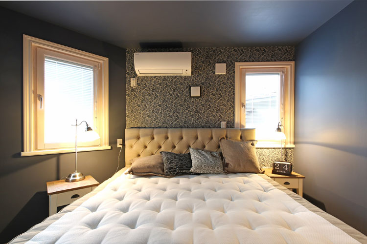 外観同様、洋画のワンシーンのような主寝室。夜の帳と同じ色の壁紙にナイトスタンドの光が映えます。