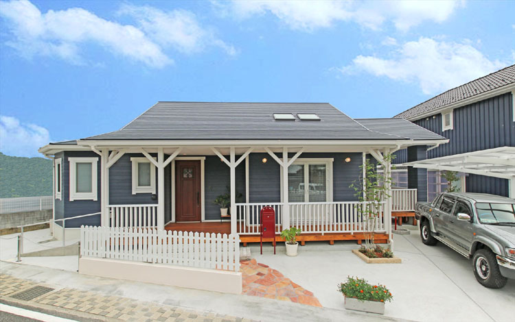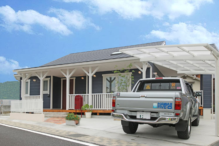 ネイビーブルーの鮮やかなラップサイディングと白い柱、平屋ならではの横に伸びて行くような水平ラインが印象的なH様邸。ピックアップトラックがよく似合い、映画のワンシーンのようです。