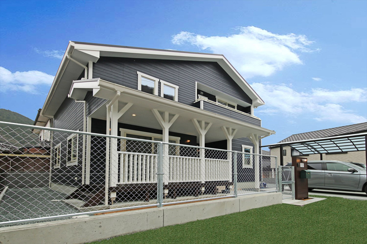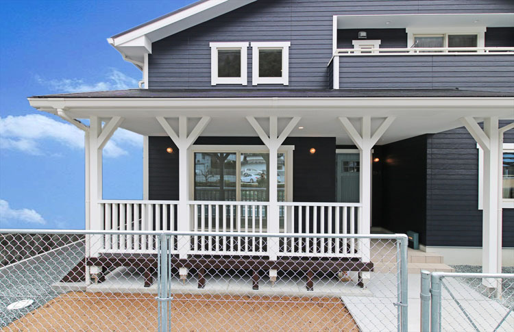 S様の思い描いた家は勾配天井のあるサーファーズハウス。大屋根を下げて特徴のある外観にし、大きなカバードポーチを付けました。カリフォルニア住宅の定番スタイルにS様流をアレンジした印象深い外観に仕上がっています。