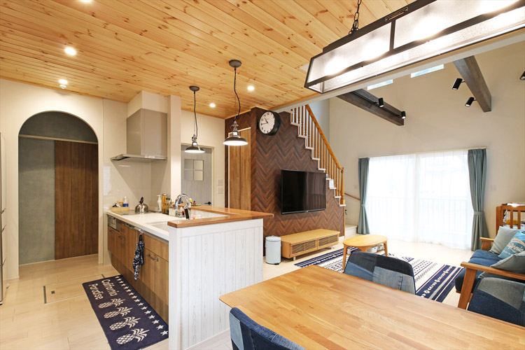 キッチンやダイニングのペンダントライトはS様が探してこられたアイテム。 スチールと木のコラボレーションが素敵です。