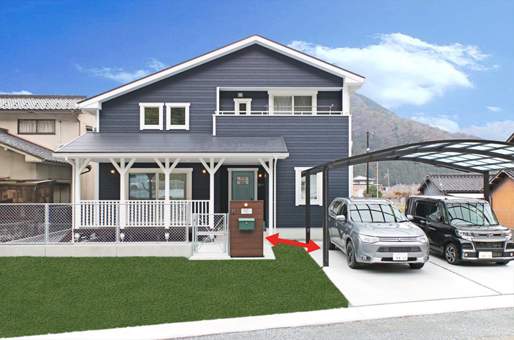 子育て世代のS様ご一家。雨天の日も濡れにくいよう、カーポートをエントランス近くに計画されました。使いやすさと見た目の美しさをあわせ持っています。