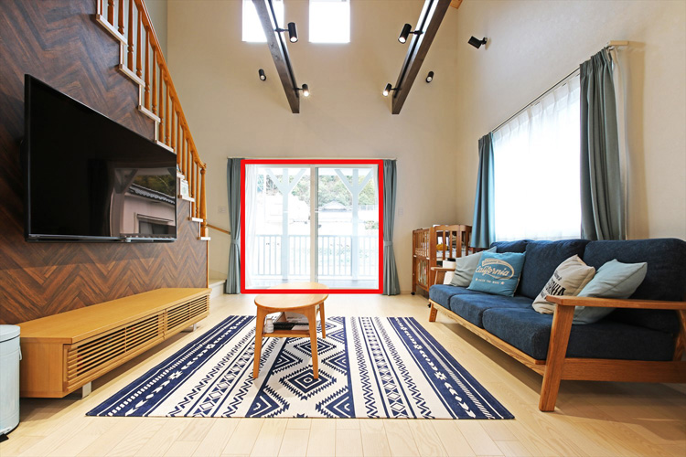 大きなはきだし窓の先にはウッドデッキがあります。屋外も屋内も快適な空間です。