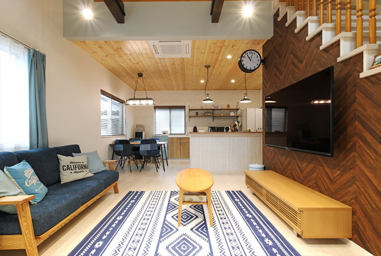 ヘリンボーンの壁紙にネイビー色のデニムソファが正にサーファーズハウス。小物はブルー系で統一され、スタイリッシュにまとまっています。