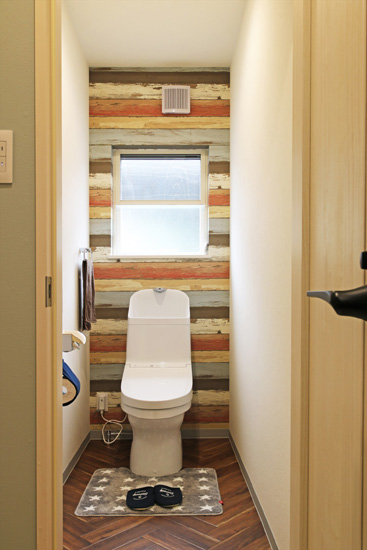 ヘリンボーンの床にポップな壁がビーチサイドの 雰囲気タップリ。楽しいトイレになりました。