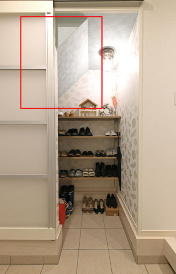 階段下を利用した無駄の無いシューズクローク。 玄関土間から高さも確保できています。