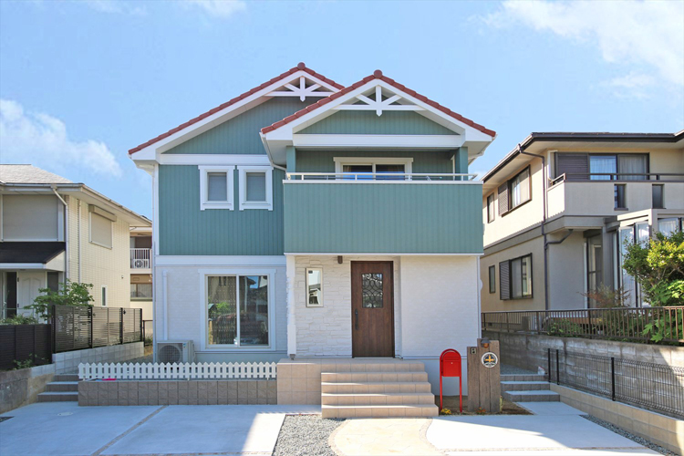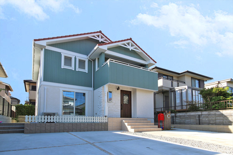 白と緑をベースにした色合いに、ドアや屋根瓦の茶色が優しく合わさり、オリジナリティー溢れるF様邸が 完成しました。