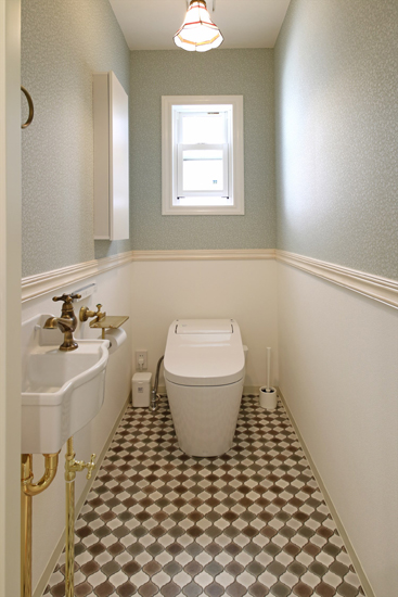 細かいアイテムを駆使して素敵な空間を演出されています。モールや貼り分けた壁紙で華やかになった空間にゴールドの 水栓やペーパーホルダーをアクセントに・・・ ホント素敵です。