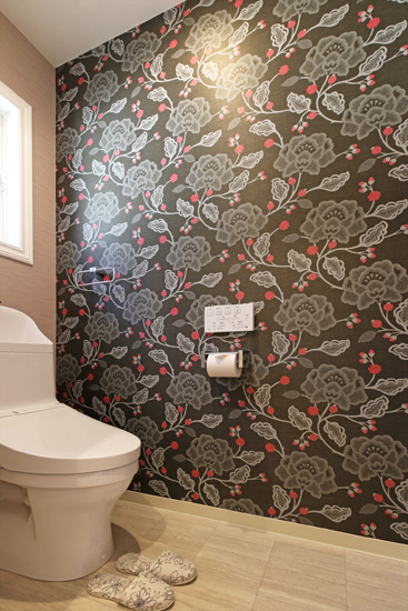 思いっきり遊び心のある花柄の黒い壁紙をアクセントに、 スリッパは逆の白い花柄でチョイス。 絶妙のセレクトを上手くまとめるF様。 流石は神戸っ子です。