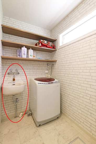 ホールに設置された洗面化粧台の場所にはスロップシンクを設置されています。上靴や泥汚れを下洗いしたりするのに便利。子育て世代のF様邸にはマストアイテムです。