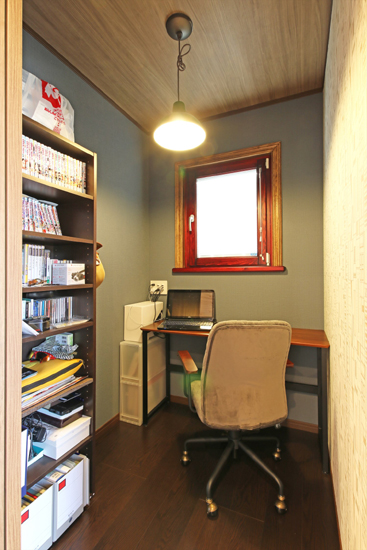 ダンディズム溢れる濃いめのカラートーンで仕上げた書斎。 バーガンティーの窓にウォルナット色のモールは かつての展示場をモチーフにされたとの事。 カッコいいお部屋に仕上がりました。