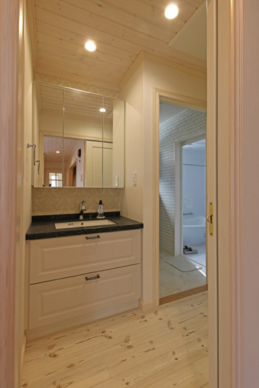 水晶石の天板に框組の扉が素敵な洗面化粧台。水回りの手前に設置されていて、非常に使いやすい場所にあります。